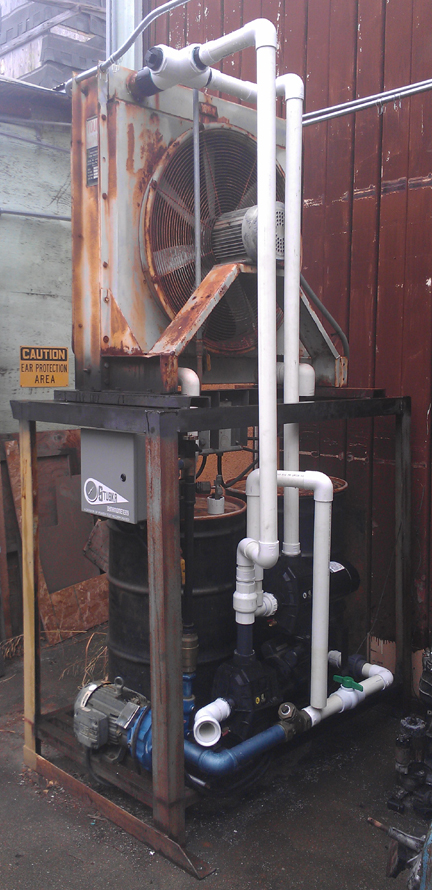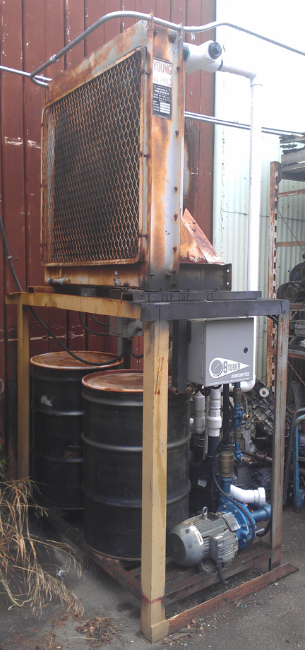 The radiator stand supports a 1200 continuous horsepower radiator which is roughly fmy feet square and 10" thick, and cooled via a ducted 5hp fan. Below this is a section where electrical connections are made and below this, three water pumps and two 55 gallon drums provide the water services the brake requires.