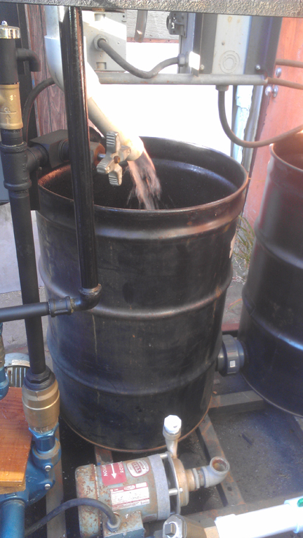 AT RIGHT: This image shows the water system in an earlier configuration than present but clearly shows the two 55 gallon drums are joined with 3" union at their base, the right one of which feeds the primary pump (in blue, lower left) via a 2" pipe (blue and white at bottom). The white pipe feeding the left drum is from the 1200 continuous hp radiator situated directly above the drums, so that is return water from the brake. The black pipe running vertically with a 90 elbow in the foreground left has been removed. The bronze fitting on the lower left is a check-valve on the primary pumps discharge, and the flow continues upward to a vacuum breaker (bronze fitting with chrome cap). Just below that is a T fitting with the original load valve repurposed as a controllable return-to-tank feature which permits the system to provide very low loading at low RPM when running-in small engines (like, say, 36hp VW) where the pump's minimum capacity may be too great. At the bottom of the image is the system's original return pump, since replaced with the new self-priming return pump. Also just barely visible at the bottom is the primary pump's feed, with filter (just right of center), and valve (green tip of wich is at the extreme lower right).