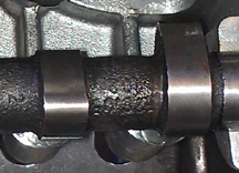 BELOW LEFT: Here's a mis-ground rocker arm someone "refaced" in the past. Note how the rocker is only making contact on the extreme left edge of the valve stem! The result of this situation is both excessive wear of the valve stem and also that a "pocket" develops on the rocker arm, making valve adjustments difficult! The rocker was, no doubt, refaced "by hand".