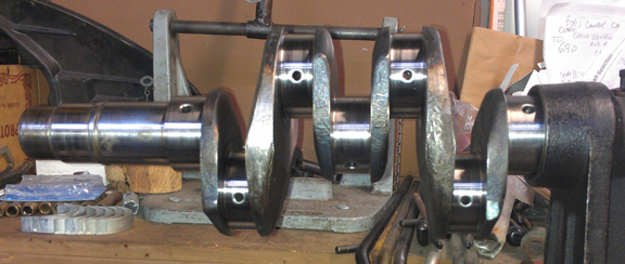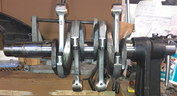 BELOW RIGHT: The crank, ready for bearing and gears. Note the ink used in balancing the rods (recording weights in grams) can still be seen on a couple of the beams, just below the wrist pin. You can also see the line where removal of material on the big and little ends occurred during the balancing process. They're balanced end-for-end and total weight to 0.1g.