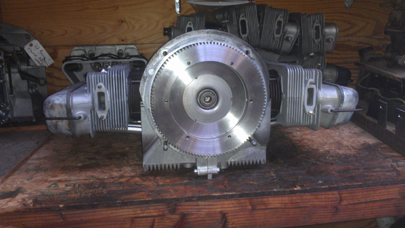 The flywheel is a stocker (180mm, 6v ring gear), in fine shape - well, at least it is now, after I cleaned it up and refaced the friction surface. I didn't fit a pressure plate to it because this engine could be put into an earlier or later car and there are two different pressure plates one might choose from - better you choose! Or, just run your old one! (I can mate it to the flywheel and balance the two together for you if you'd like - this is highly recommended.)