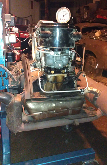 AT RIGHT: The as-run-in-the-C build being Dyno tested. Note the direct read out oil pressure gauge is resting on top of the left air cleaner. From what you can see here, ONLY the long-block, barely visible, remains in this build!