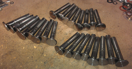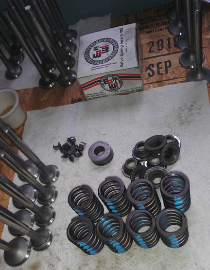 AT RIGHT: The valves (foreground left), springs, shims, retainers and keepers used in this engine, ready for assembly.