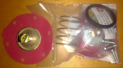 AT LEFT BELOW: You can see the alcohol safe diaphragm to the left of the standard rebuild kit. Note the difference in the color of the plating, a yellow instead of silver.