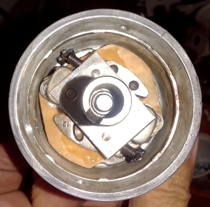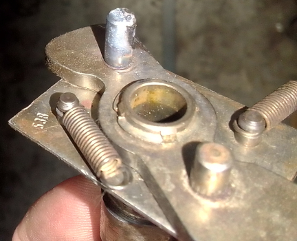 ABOVE LEFT & RIGHT: At left is the distributor's advance limiting peg, which was well worn, having been welded up and reshaped to "remove" the wear. At right is the inner assembly from above and as can easily be seen the micarta plate the advance weights slide on has been replaced, lubrication easily visible. Further, in both images, the "double ended single loop" springs, the toughest ever used and long not available new, are still in service. Further, in the right image one flyweight can be seen to be a "double" and another "single," thus reflecting an adjusted curve using the same technique Bosch itself used during the period of manufacture sometimes: Most had two double flyweights, some had one double, one single, like this. (This I learned circa 1990 from Richard V. Lukes, famed engine builder of Lukes & Shorman in Berkeley CA.)