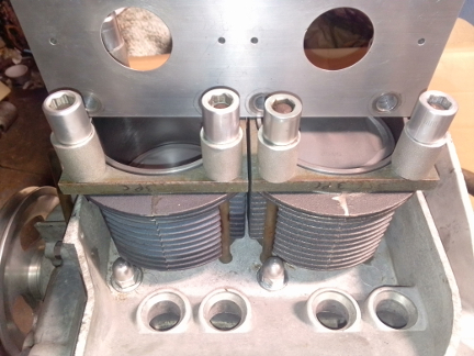 AT RIGHT: I leave the piston rings off after balancing, as noted above, thus permitting easy checking. Here I install them in cylinders, locked down with special fixtures and make sure the cylinders are in the same plane.
