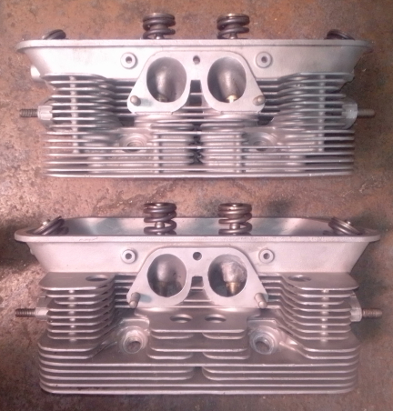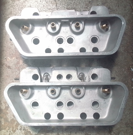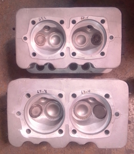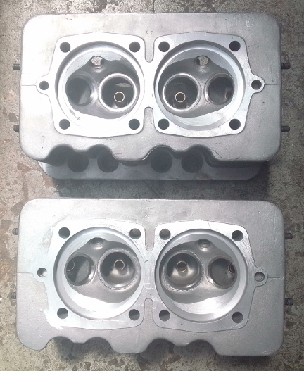 BELOW LEFT & RIGHT: These B heads have had their intake ports opened up to 356 C dimensions, new guides have been installed, and they've been both decked and flycut. A conical, 30 degree cut was performed to clearance them for use with later piston sets. Note that one head had a cracked valve guide boss inside the intake port which I welded up (left image, lower head, right port).