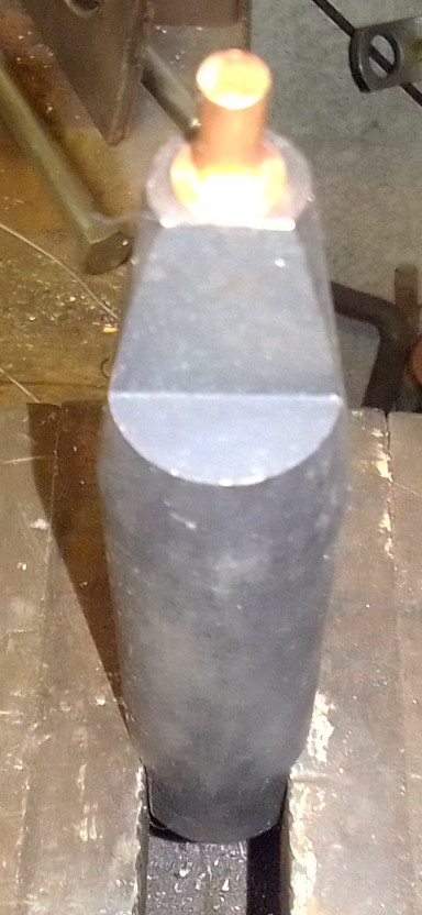ABOVE & AT RIGHT: The anvil is mounted into a vice, the rivet placed upon it, then the sump plate, and finally the magnet. Then, the rivet is crushed and the job is done. ... I normally paint, or even powder coat, the sump plate before this is done and I'm not sure why it wasn't in this instance! But, painting after is about the same as painting without doing this job!